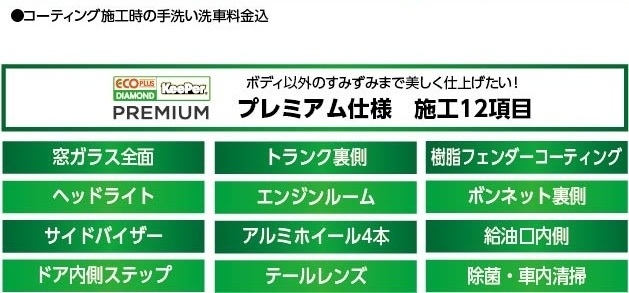 ECOプラスダイヤモンドキーパープレミアム仕様はボディー以外にも上記12項目の部分も合わせてコーティングします。細かな部分も美しく仕上げたいお客様におススメになります。