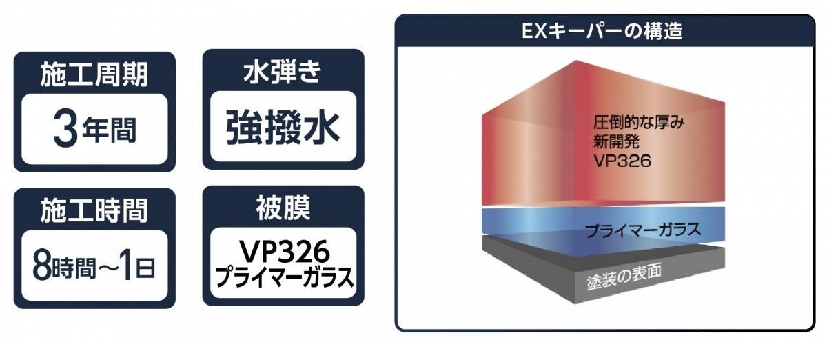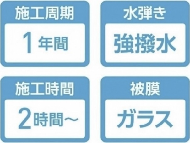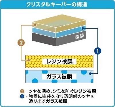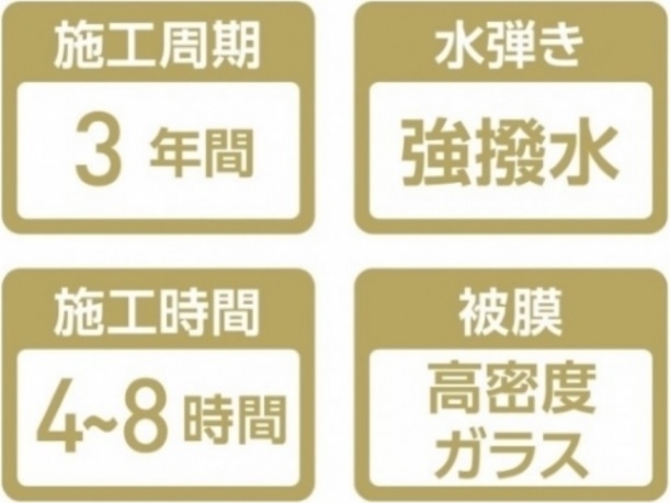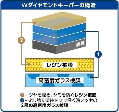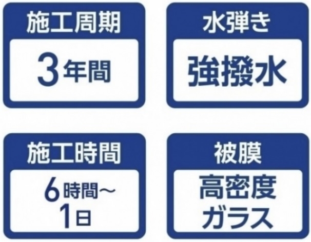 ノーメンテナンス3年間保証。1年に1回のメンテナンス(被膜の入れ替え)で5年保証。2層の高密度ガラス被膜が実現する最上級の艶感。