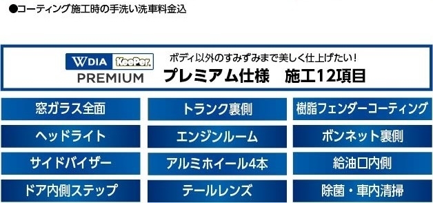 Wダイヤモンドキーパープレミアム仕様はボディー以外にも上記12項目の部分も合わせてコーティングします。細かな部分も美しく仕上げたいお客様におススメになります。