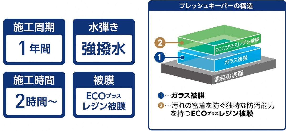 ノーメンテナンス1年保証。ECOプラスレジン被膜には自浄効果があり、自然の雨がホコリなどの汚れを落とし、まるで洗車をしたようにキレイになります。