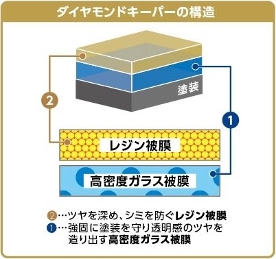 ノーメンテナンス3年保証。1年に1回のメンテナンス(被膜の入れ替え)で5年保証。ガラス被膜+レジン被膜の2層構造で、独特の深い艶感。
