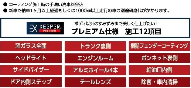 EXキーパープレミアム仕様はボディー以外にも上記12項目の部分も合わせてコーティングします。細かな部分も美しく仕上げたいお客様におススメになります。