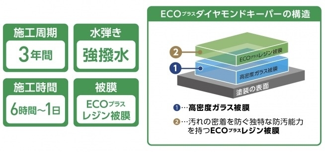 ノーメンテナンス3年保証。2年に1回又は1年に1回のメンテナンス(被膜の入れ替え)で5年保証。ECOプラスレジン被膜には自浄効果があり、自然の雨がホコリなどの汚れを落とし、まるで洗車をしたようにキレイになります。