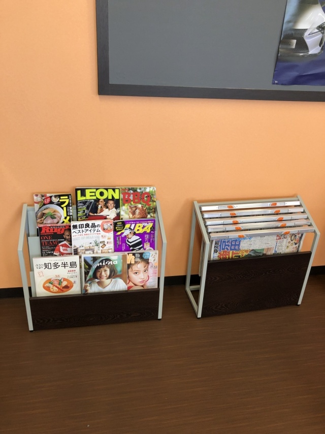 コーティング施工中は店内待合室でゆっくりお寛ぎ下さい!各種雑誌取り揃えてます☆もちろん台車も無料で準備しております。