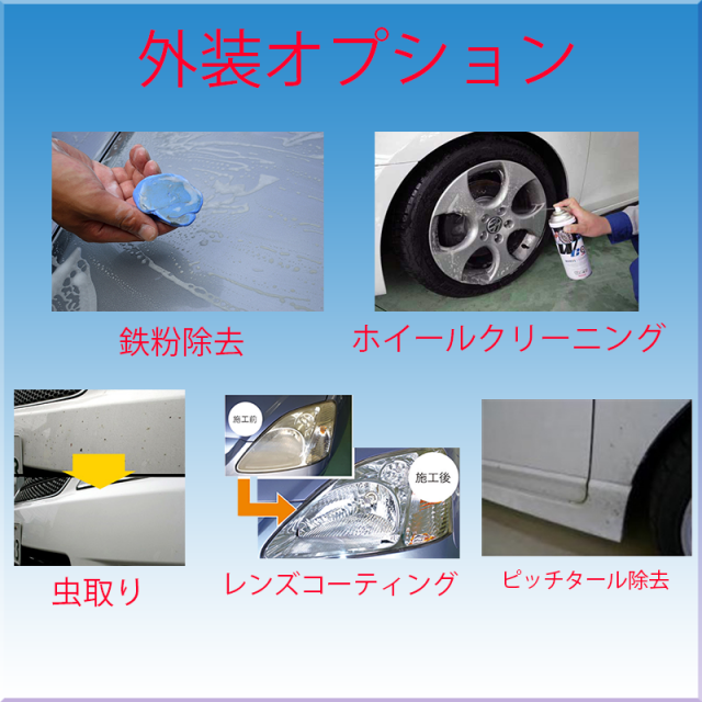 外回りオプションは虫取りや鉄粉除去、ピッチタール除去など多種多様なメニューを取りそろえております!