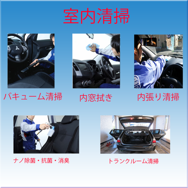 室内清掃はバキューム清掃や内窓ふき、ダッシュボードなどの内張り清掃など多彩なメニューがあります!