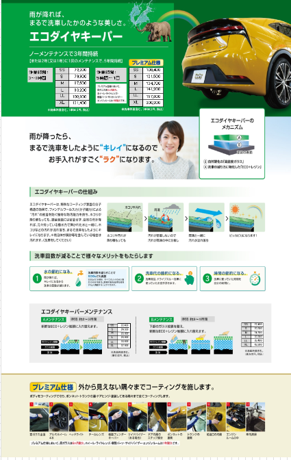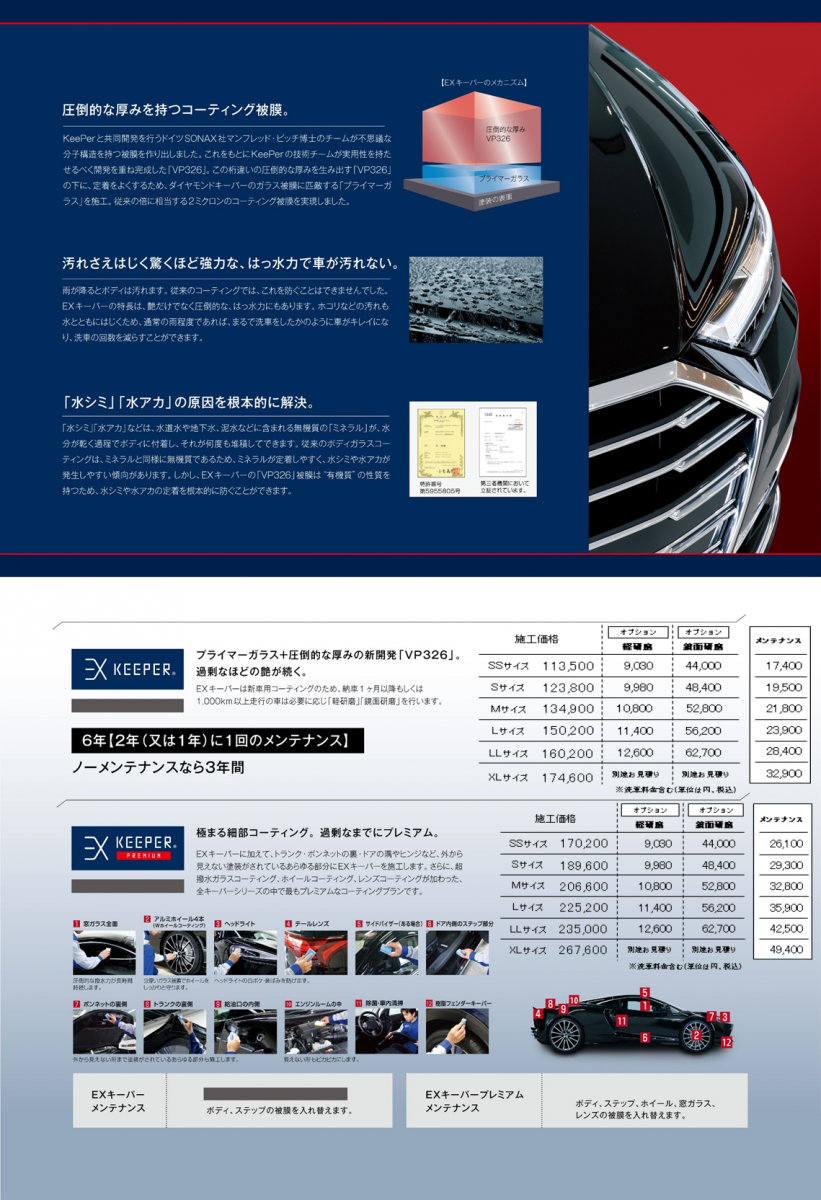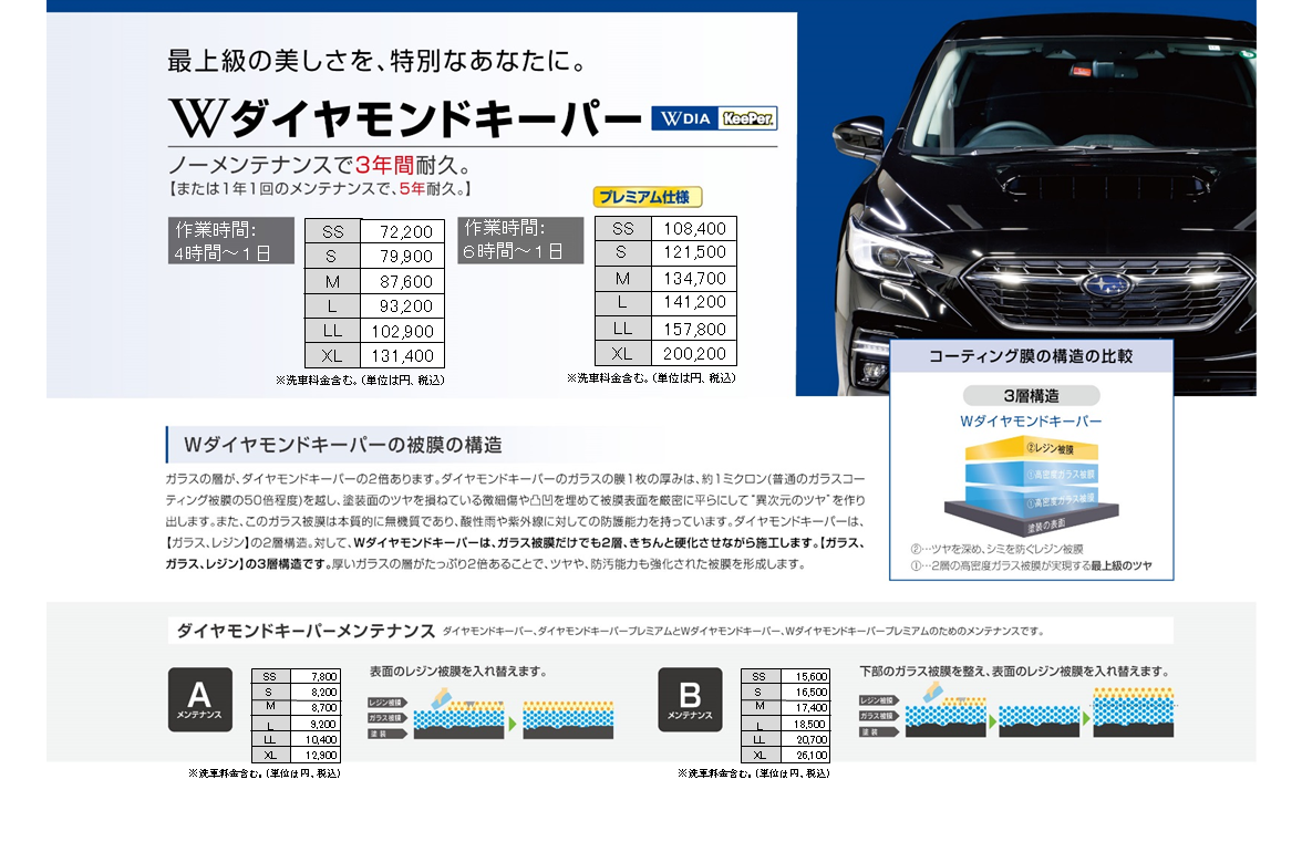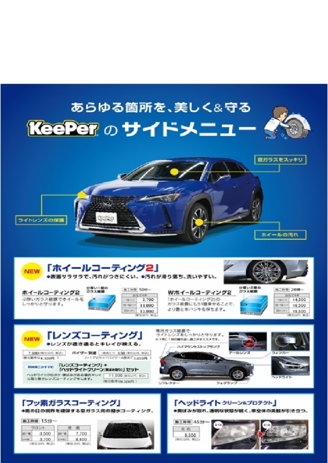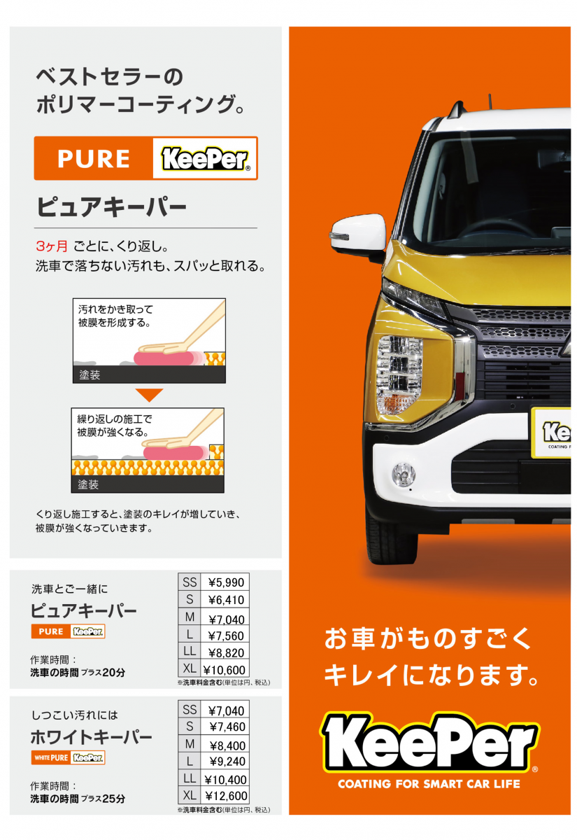 キーパーコーティングは、新車に施工すると新車よりも、もっと輝きを放ちます。すでにお乗りの愛車も、新車のようによみがえります。 コーティングした後は、お好きな時に洗っていただくだけで、ずっとキレイが続きます。 ご自身にピッタリのコーティングをご検討される中で、1つの目安として、ご覧ください。 ご不明なことは、スタッフまでお声掛けください。 店舗によって施工価格、費用、サイズ分けが異なる場合がございます。詳しくは各店舗までお問い合わせください。