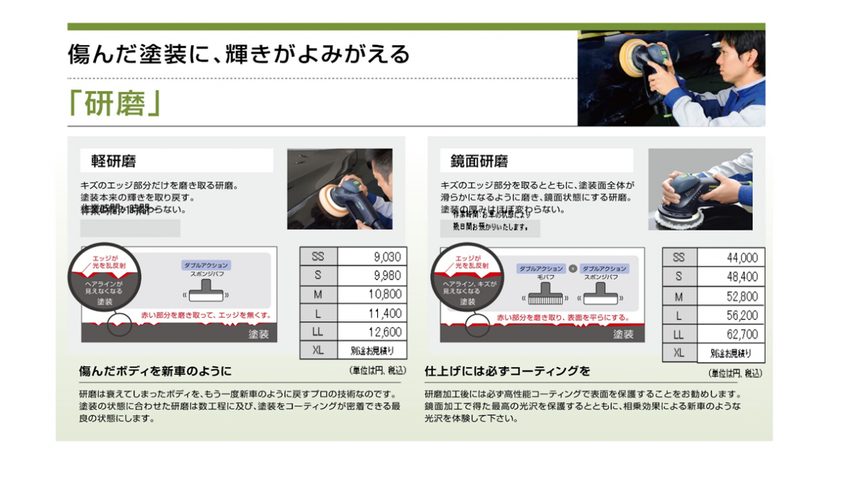 研磨は衰えてしまったボディをもう一度新車のように戻すプロの技術です。