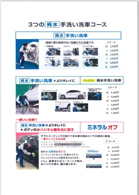 当店の手洗い洗車は、純水を使用しております。 純水は水道水などに含まれるミネラル分を取り除きます。 また、水ジミが付きにくく、純水独自の透明な仕上がりを実現します。