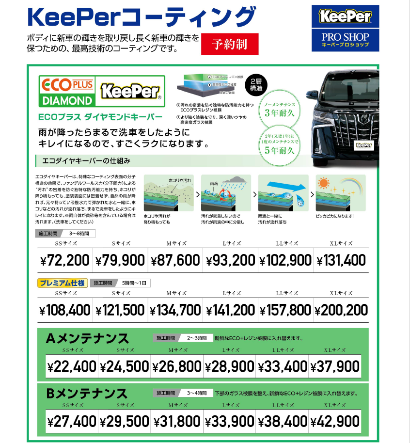 続いてはエコダイヤキーパーです。 従来のコーティングのようにツヤや水弾きは抜群、それに加えて 汚れにくさがパワーアップしています。