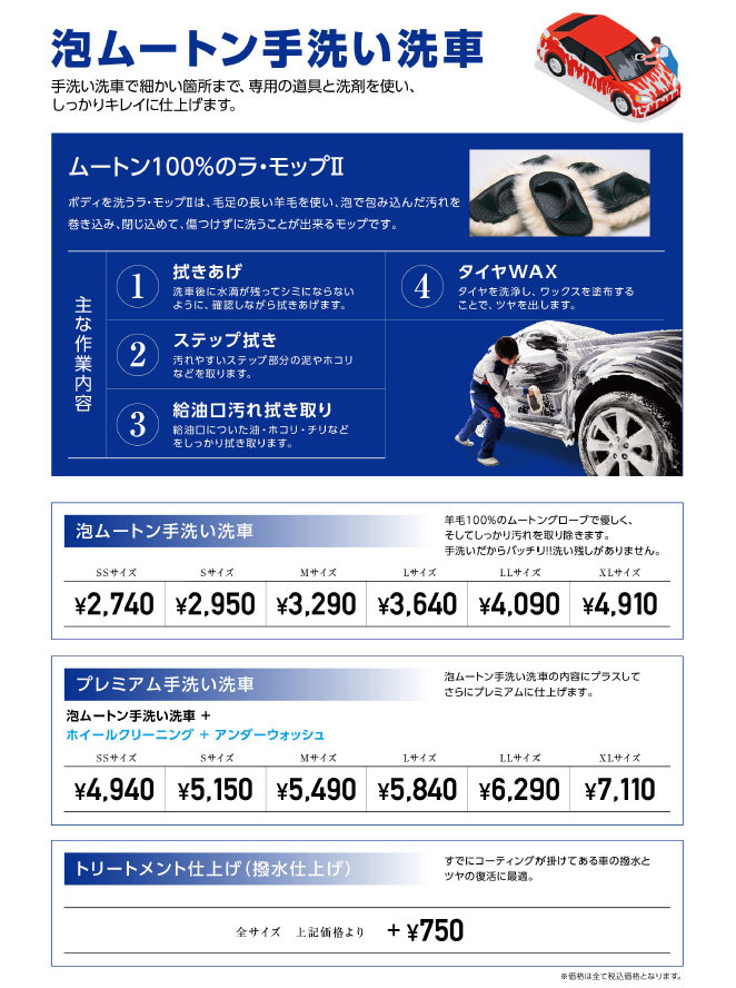 カーコーティングや手洗い洗車、ドライブスルー洗車機完備!