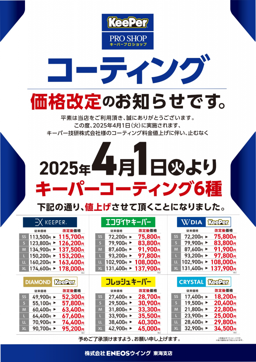 キーパーコーティングメニュー