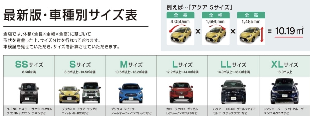 当店では、体積(全長×全幅×全高)に基づいて 形状を考慮した上、サイズ分けを行なっております。 サイズ表にない車は、車検証を見せていただき、 サイズを計算させていただきます。