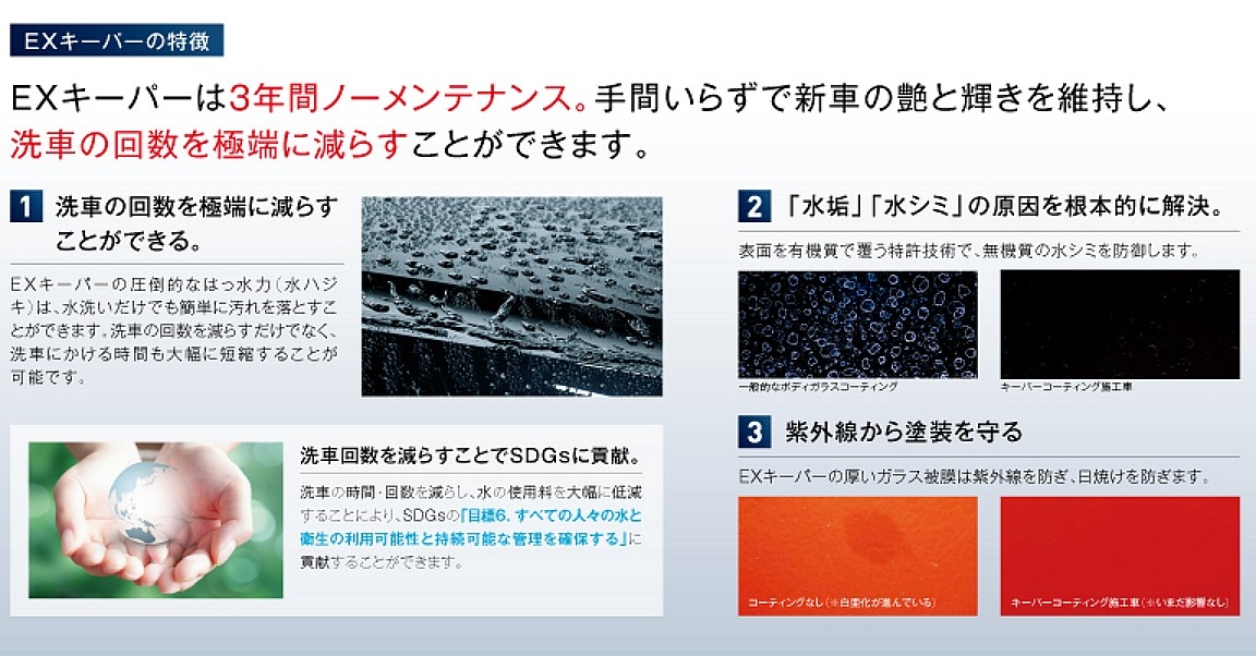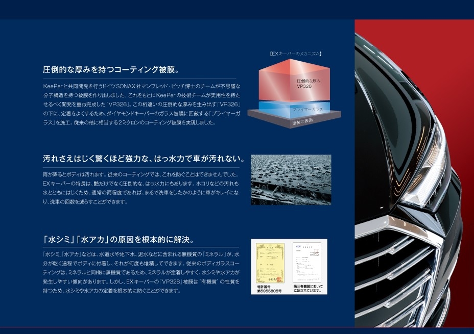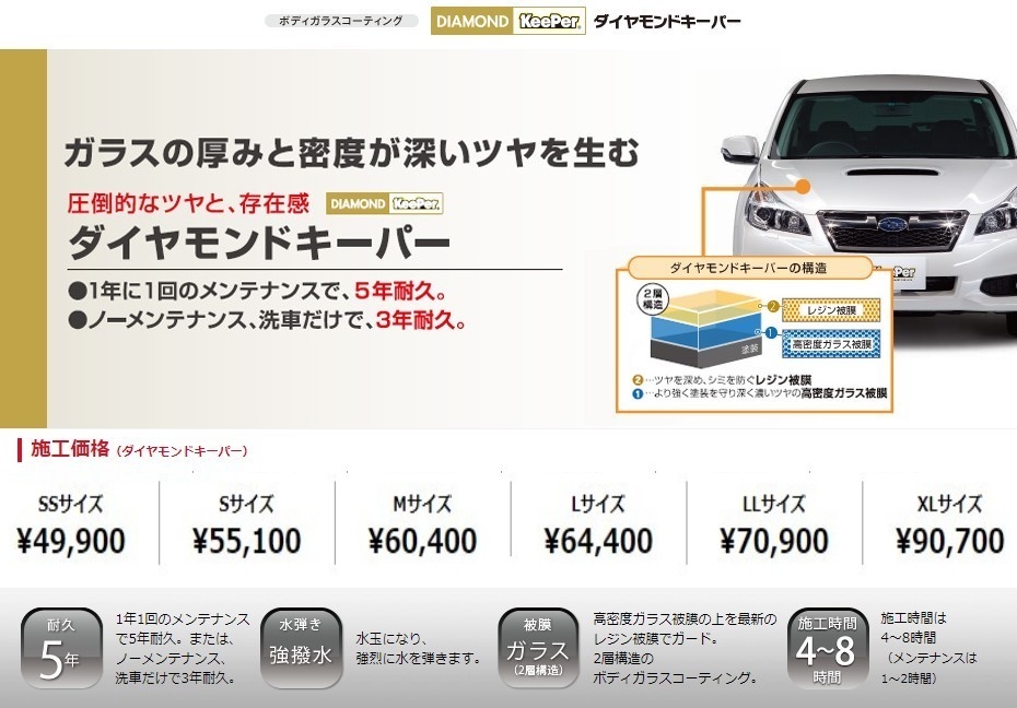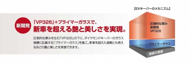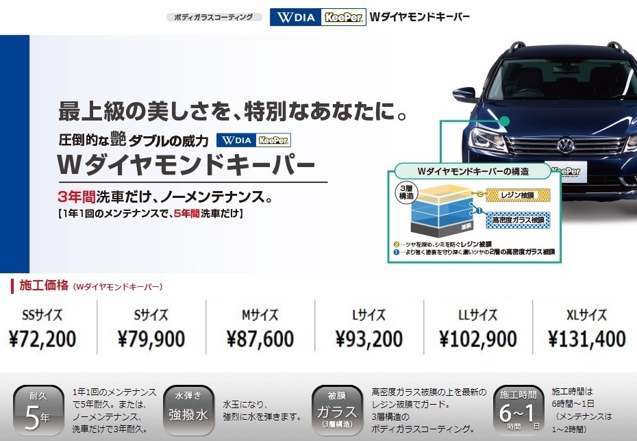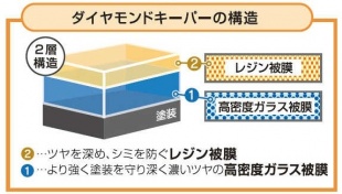 ガラスの層が、ダイヤモンドキーパーの2倍 あります。ダイヤモンドキーパーのガラスの膜1枚の厚みは、約1ミクロン(普通のガラスコーティング被膜の50倍程度)を越し、塗装面のツヤを損ねている微細傷や凸凹を埋めて被膜表面を厳密に平らにして”異次元のツヤ”を作り出します。また、このガラス被膜は本質的に無機質であり、酸性雨や紫外線に対しての防護能力を持っています。
