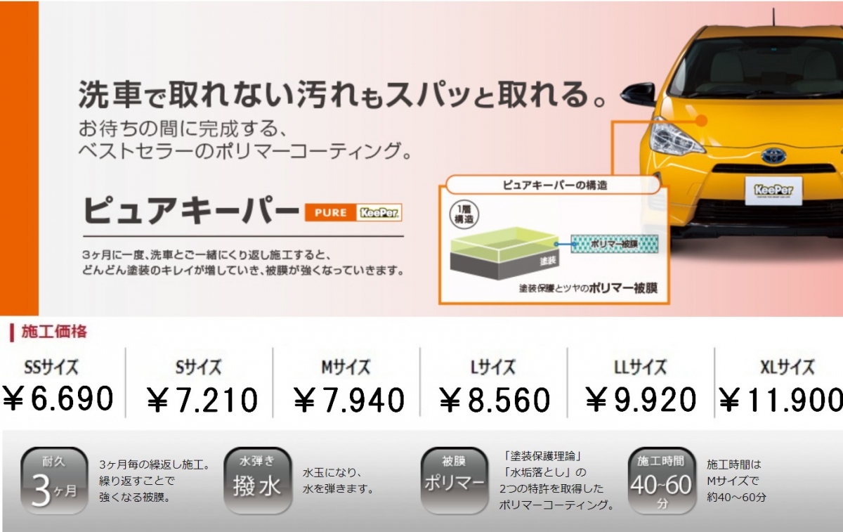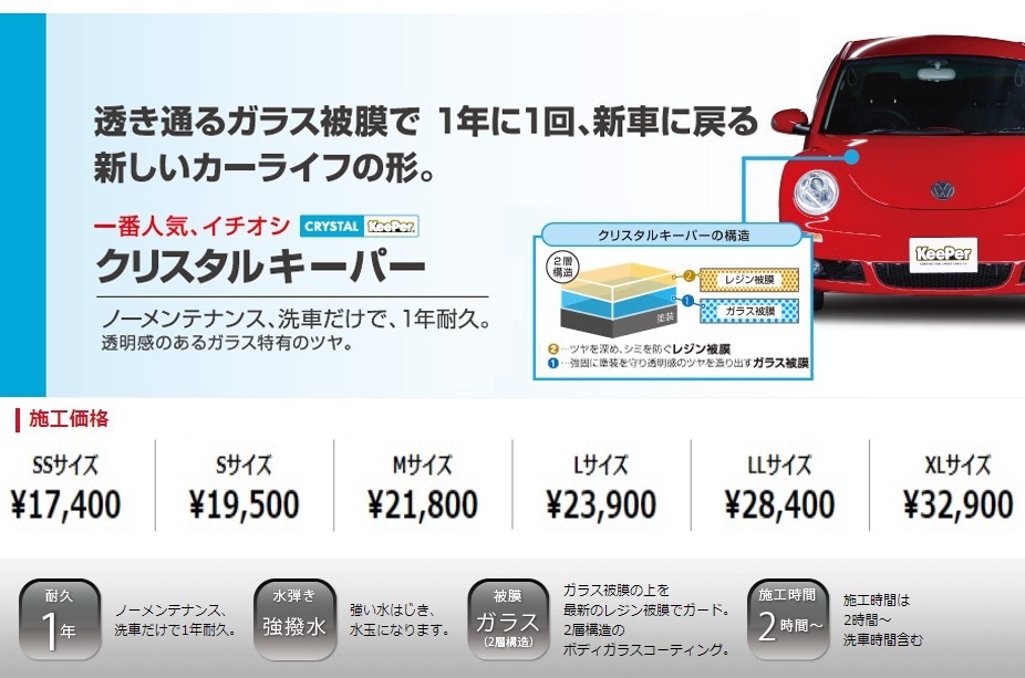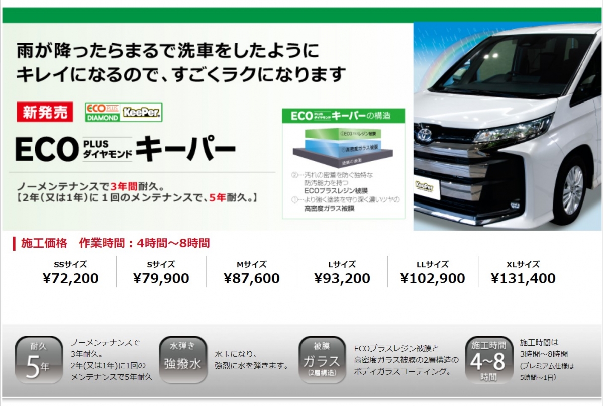 新車のお車にピッタリのキーパーコーティング。新車時の塗装を長くキレイに保ちます。今お乗りのお車にも、もちろんお勧めです。