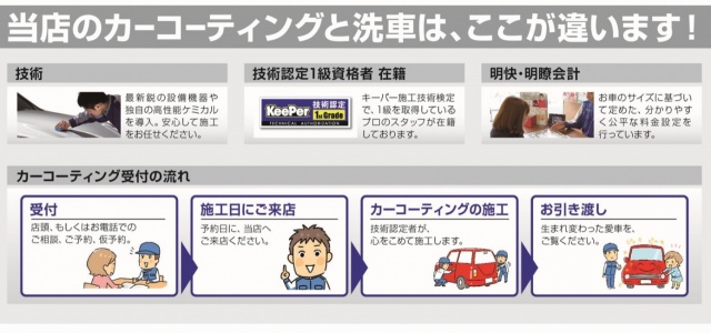 『洗車・コーティングを通して お客様に 感動 してもらえる施工を!!』を合言葉に、全力でしっかりとした施工を心掛けています。 また更なる技術向上の為「店内練習会」をはじめ キーパー技研主催の「勉強会」「技術コンテスト」「選手権」などにも進んで参加しています。