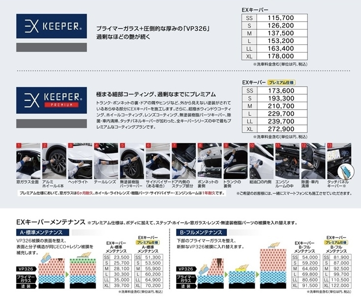 EXKeePerはノーメンテナンスで3年間耐久、2年(又は一年)に一回のメンテナンスを行って頂くと最大で6年耐久します! 新車だから!キレイに維持したい方! 絶対にご満足いただけるかと思います この機会に是非、いかがでしょうか? お電話、ご来店お待ちしております!