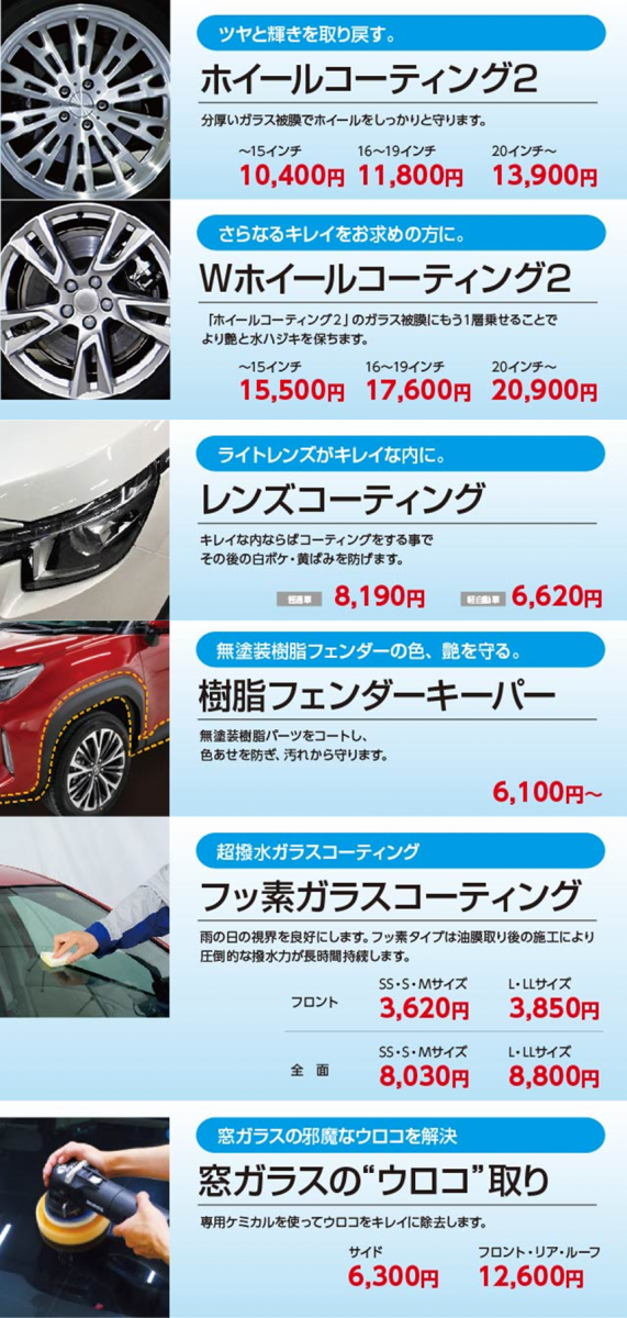 例えば、ブレーキダスト、泥汚れから守る「ホイールコーティング2」雨の日の視界を確保する「窓ガラス撥水コーティング」ヘッドライトの黄ばみ・くすみを取り除き、コーティングする「ヘッドライトクリーン&プロテクト」下回りの錆を防止する「アンダーコート」など各部分をコーティングするメニューをご用意いたしました。