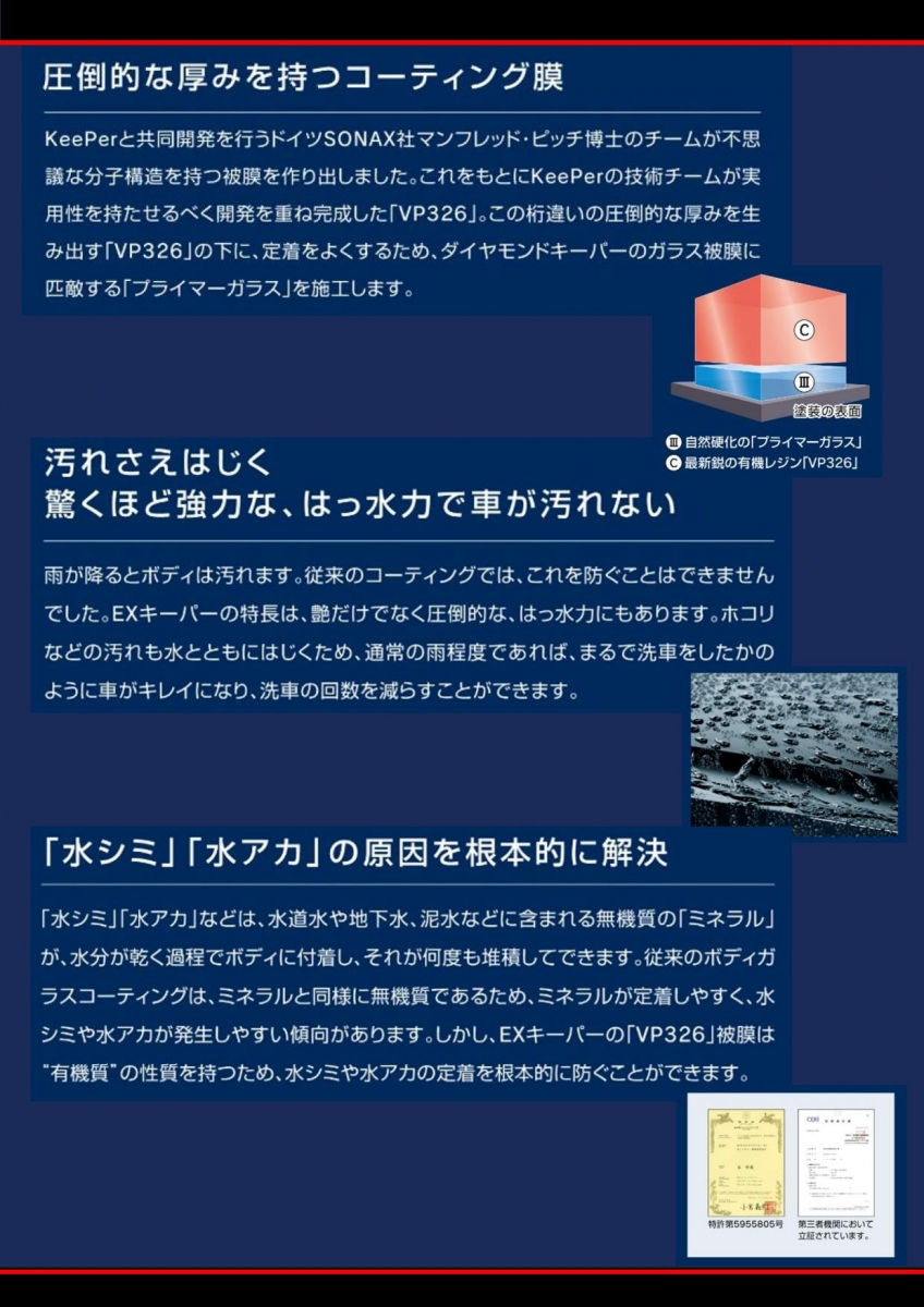 ガラスの厚みと密度が深いツヤを生むボディガラスコーティングです。