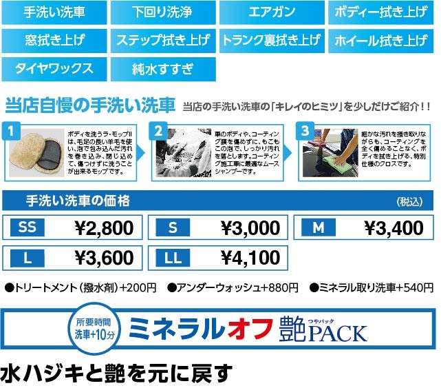 機械洗車も、ドライブスルーではなくスタッフ洗車で対応させて頂きますので、洗車後の拭き上げ・タイヤWAXも込みの価格で対応させて頂きます。