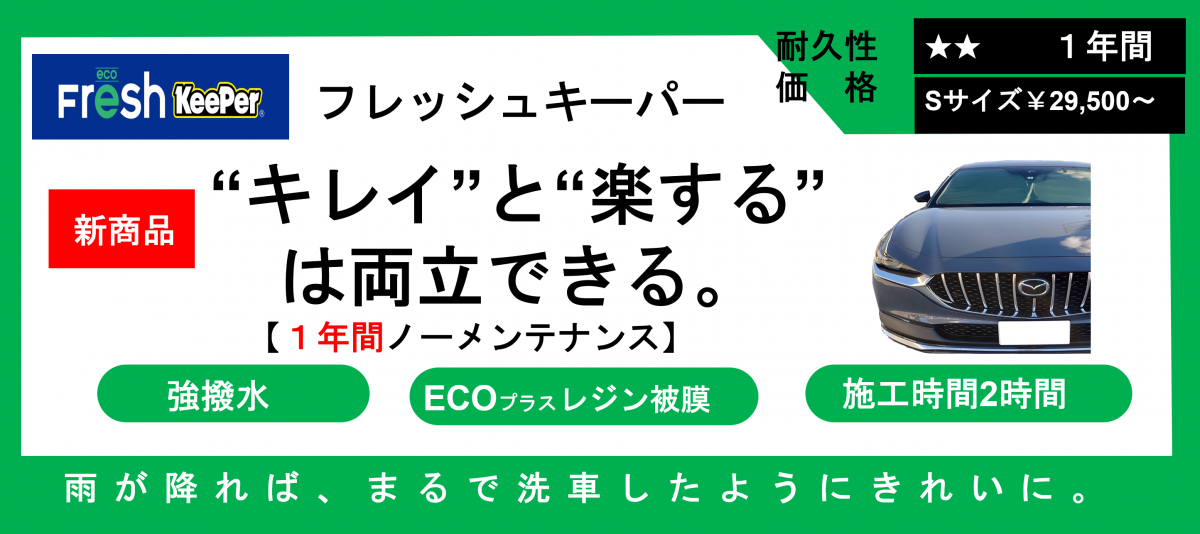 フレッシュキーパーは、汚れの密着を防ぐ独特な防汚能力を持ち、ホコリが降り積もっても塗装表面には密着せず、自然の雨が降れば元々持っている撥水力で、雨と一緒に汚れが流れ落ち、まるで洗車をしたようにキレイになります。
