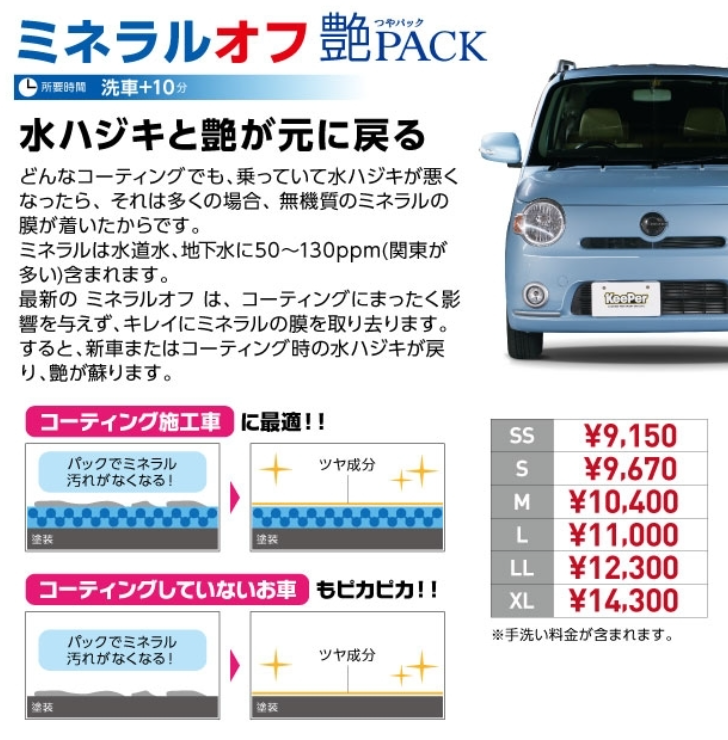 広くて居心地の良い待合室や冷暖房付の コーティング専用ブースを完備した キーパープロショップです。 経験豊富なコーティング技術【1】級資格者が 丹精込めて1台1台丁寧に施工致します。 【代車5台完備】 代車代金については貸出中に乗られた距離に対して 1㌔あたり15円で貸出しております。