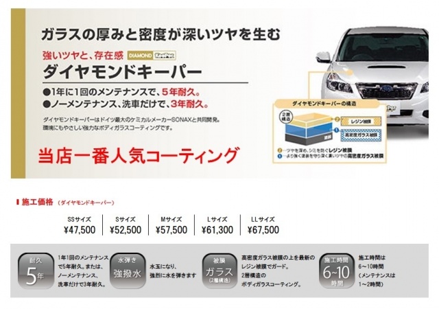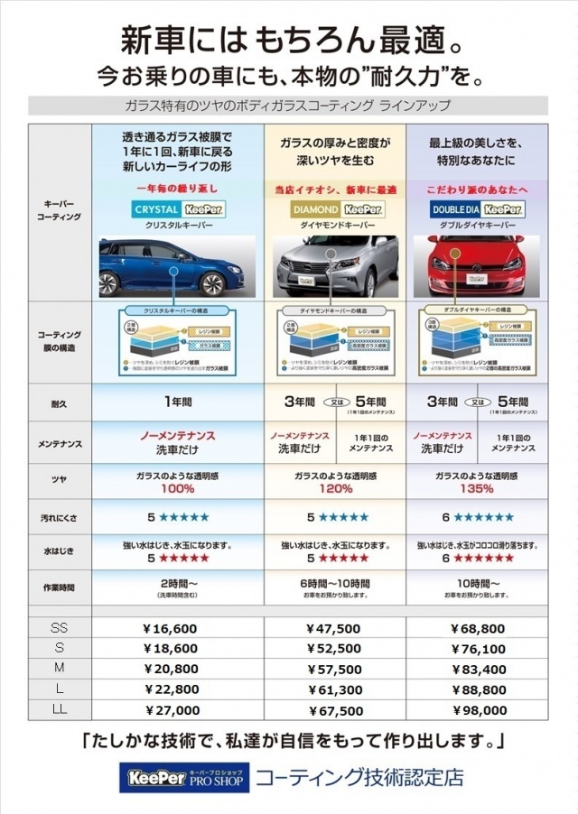 ピュアキーパーからWダイヤモンドキーパーまでお客様の満足のコーティングを自信を持っておすすめ致します!!! すべてはお客様の満足のためにスタッフ一同お待ちしております!! フッ素ガラスコーティングやホイルクリーニング、ヘッドライトクリーン&プロテクトといったアラカルトメニューも充実してます!!!