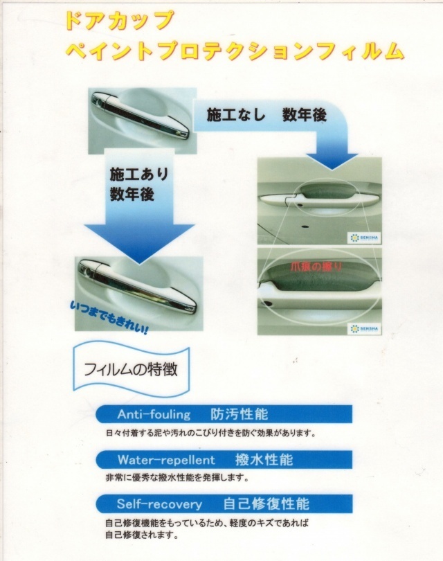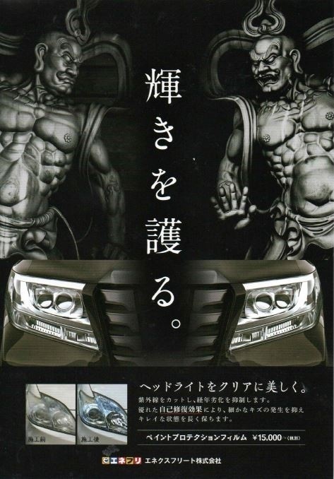 エネフリから新しい提案です。 お車のヘッドライト。何度磨いても・・・という声にお応えして、ペイントプロテクションフィルム。登場です。 ヘッドライトを磨きコーティングしてから、ウインドフィルムを張るように、ヘッドライトをフィルムで保護します。 紫外線による劣化、軽度の飛び石にも対応。 優れた自己修復効果により細かな傷の発生を抑えきれいな状態を長く保ちます。