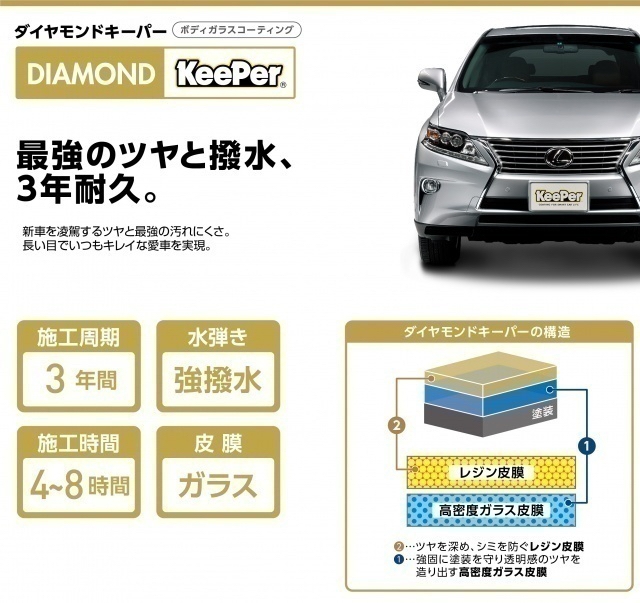 ダイヤモンドキーパーは独特のガラス被膜と特殊なレジン被膜の二重の被膜で出来ています。1層目のガラス被膜で塗装面の凸凹を埋めて"異次元のツヤ"を作り出しています。2層目のレジン被膜は表面が有機質の性質を持っているので無機質のミネラルが固着してできる「水シミ」を防止することが出来るコーティングです。