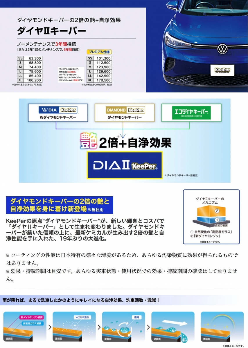 また、クリスタルキーパー以上のコーティングには1か月後を目安とした点検洗車が付属しています。点検洗車をしなくても品質への影響はありませんが、せっかくの機会ですのでぜひご利用ください。