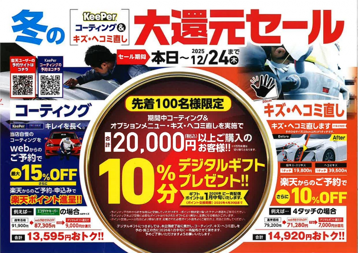 こんにちは、東海加木屋店の中畑です。今回は、現在開催中の大還元セールの告知と、ホワイトキーパーってお得だよねー。という内容です。現在先着100名様限定。デジタルギフト券10%分プレゼントしちゃいます!...