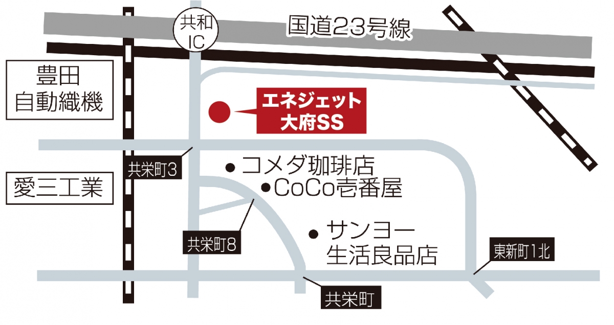 - 当店は、愛知県大府市共栄町の国道23号線共和インターを降りて南へ200Mの所に位置しておりますセルフSSです。