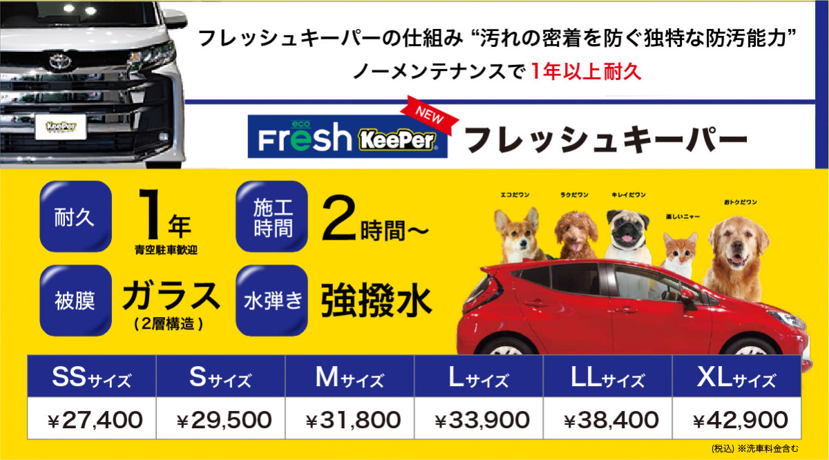 新登場のフレッシュキーパーはコスパNo.1の激推しメニュー✨施工時間約120分〜 SSサイズ27,400円〜 フレッシュキーパーは、汚れの密着を防ぐ独特な防汚能力を持ち、ホコリが降り