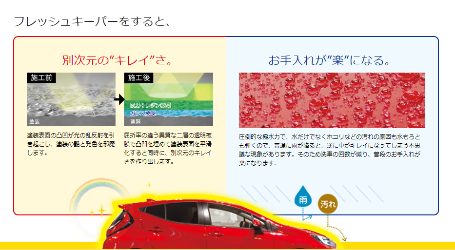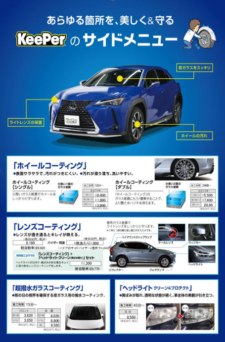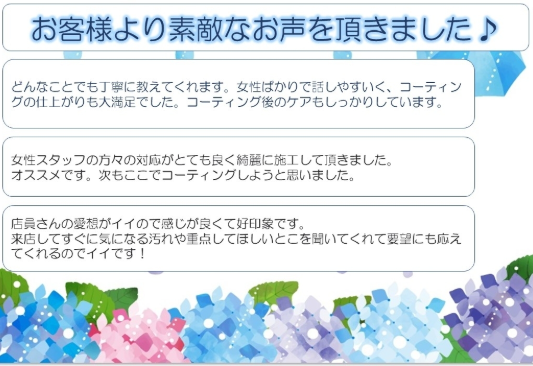 私たちがお客様の大切なお車を 綺麗に長持ちするお手伝いをさせていただきます! 新車でも、長く乗っているお車もお客様の大切なお車に変わりはありません 大切なお車だからこそ綺麗に長く乗っていただきたいと思います! 私たちはkeeperコーテイングの技術認定者の資格も全員が持ち お客様が安心してお車を預けていただけるようにトレーニングもしています 自分の車よりも大事に、丁寧に、、、 お客様の喜んで下さる顔、驚いて下さる顔を思い浮かべながら日々施工しています!! 「ここに任せて良かった」「ここで次もお願いしよう」と 思っていただけるお店を常に意識して行なっています! お客様の大切なお車を是非、私たちに綺麗にさせてください! ご来店、ご相談、いつでもお待ちしています(*^^*)!
