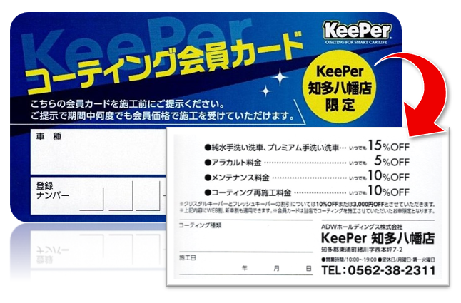 当店でコーティングしていただいたお客様にお渡ししている有効期間内のコーティング会員カードをお持ちのお客様はキーパー施工車料金から-500円になります。(Aコース2000円、Bコース3000円でご利用できます)