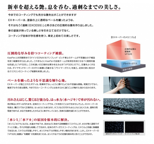 ダイヤモンドキーパーの2層構造よりさらにガラス層を追加し3層構造により、ツヤや、防汚能力も強化された。
