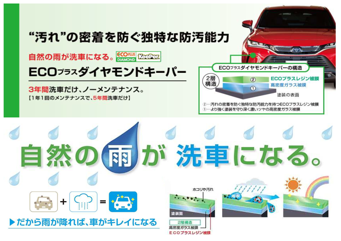 ECOプラス ダイヤモンドキーパーは、特殊なコーティング表面の分子構造の効果で、ファンデルワールス力(分子間力)による"汚れ"の密着を防ぐ独特な防汚能力を持ち、ホコリが降り積もっても、塗装表面には密着せず、自然の雨が降れば、元々持っている撥水力で弾かれた水と一緒に、ホコリなどの汚れが落ち、 まるで洗車をしたようにキレイになります。※雨自体が黄砂等を含んでいる場合は汚れます。(洗車をしてください)
