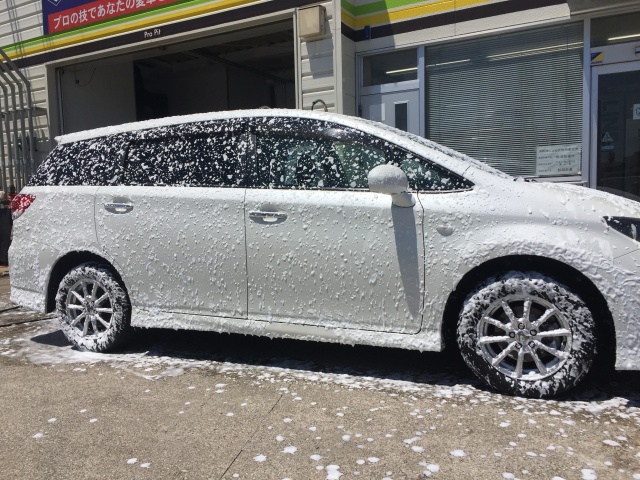 お車にかかる泡は、洗剤ではなくムースです。もこもこした泡がお車を包み込み、手洗いして洗い流すことでキレイになります。