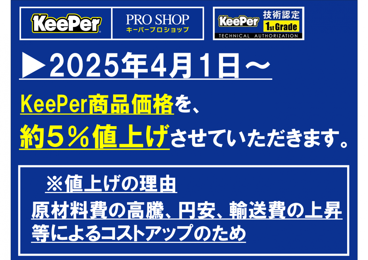 2025年4月1日~、原材料費の高騰、円安および輸送費の上昇等のため、KeePer商品を約5%値上げさせていただきます。