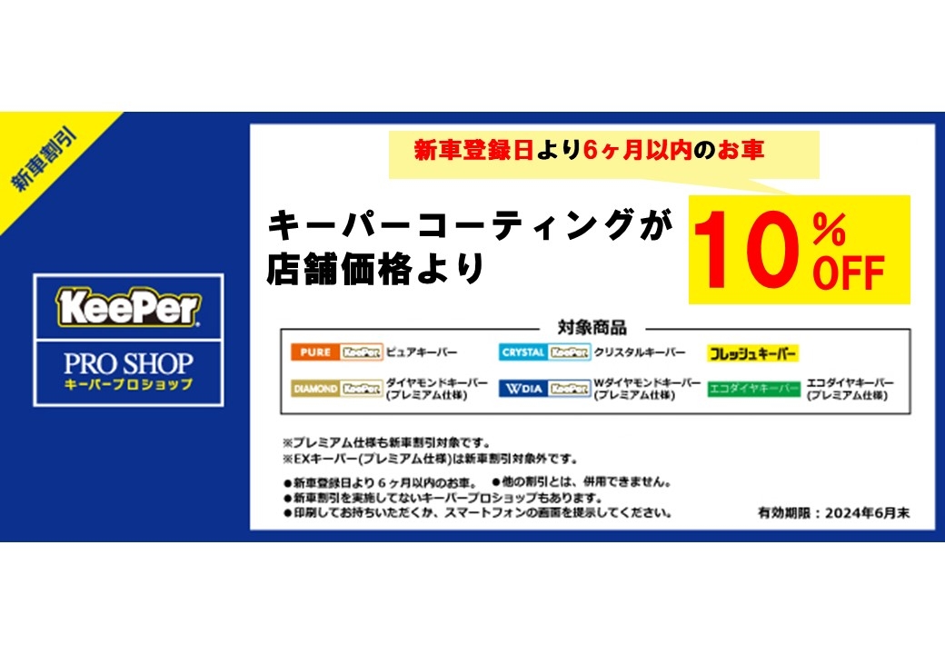 そこで当社では、より多くのお客様の愛車を守るきっかけや機会を増やし設けたいとの思いから、12月からの新商品DIAⅡキーパーおよびエコダイヤキーパー・フレッシュキーパー・Wダイヤキーパー・ダイヤモンドキーパー・クリスタルキーパーの6種類のコーティングメニューを年末年始特別価格として10%OFFでご提供する事にいたしました。
