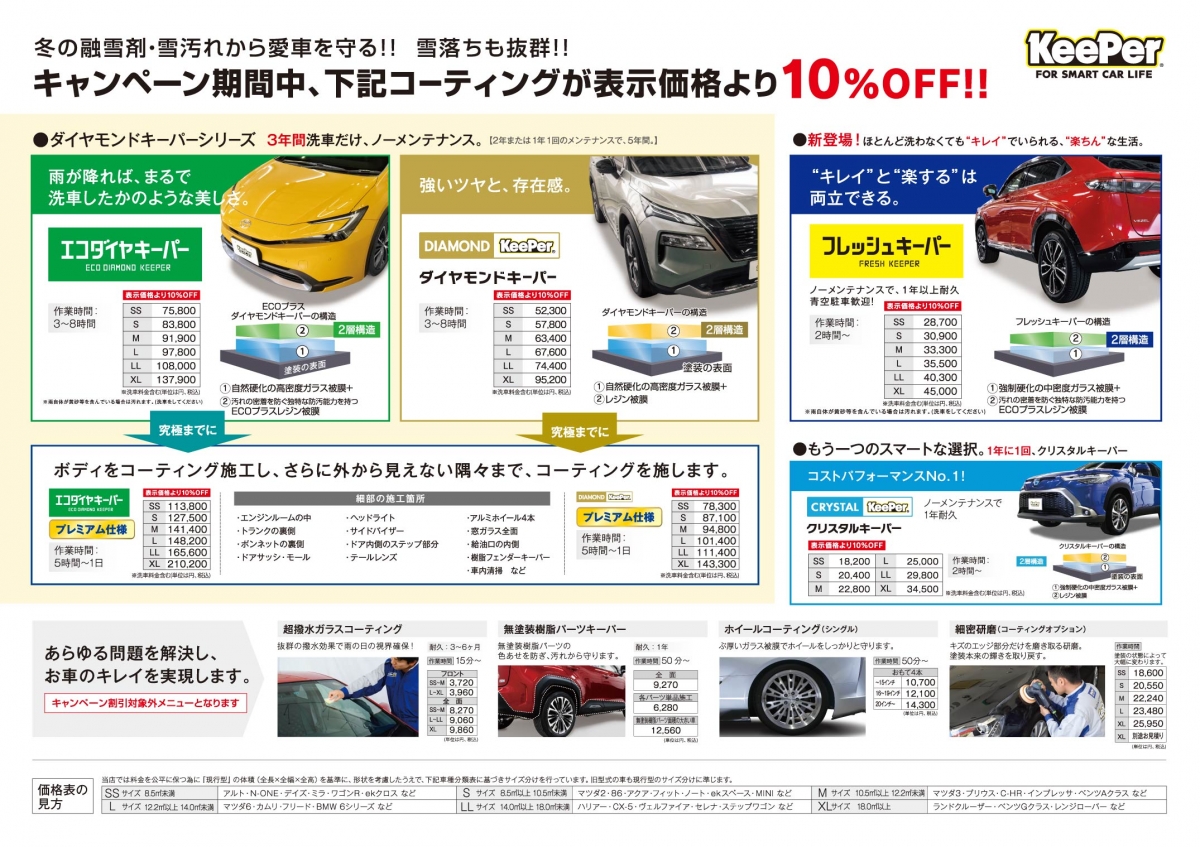 そこで当社では、より多くのお客様の愛車を守るきっかけや機会を増やし設けたいとの思いから、12月からの新商品DIAⅡキーパーおよびエコダイヤキーパー・フレッシュキーパー・Wダイヤキーパー・ダイヤモンドキーパー・クリスタルキーパーの6種類のコーティングメニューを年末年始特別価格として10%OFFでご提供する事にいたしました。