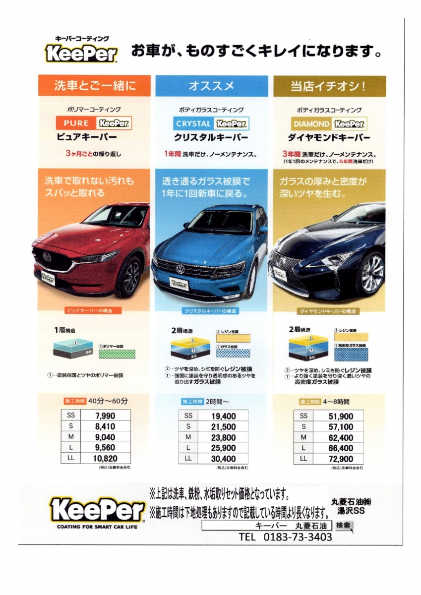 当店ではキーパーコーティング施工1級資格者が2名、2級資格者2名在籍しており、いついかなる日でもパーフェクトにお客様のご要望にお応えいたします! 当店では鉄粉、水垢取り、室内清掃は全てコーティング価格に含まれており超お得な価格となっております!(=゚ω゚)b お気軽に当店または当店スタッフにお問い合わせください!