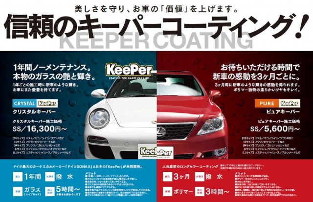 KeePerコーティングは、ボディの高級感漂うツヤ、気持ちよい水ハジキ、汚れやキズからの保護など、本格的なボディコーティングがリーズナブルな価格で施工できるのが特徴です。