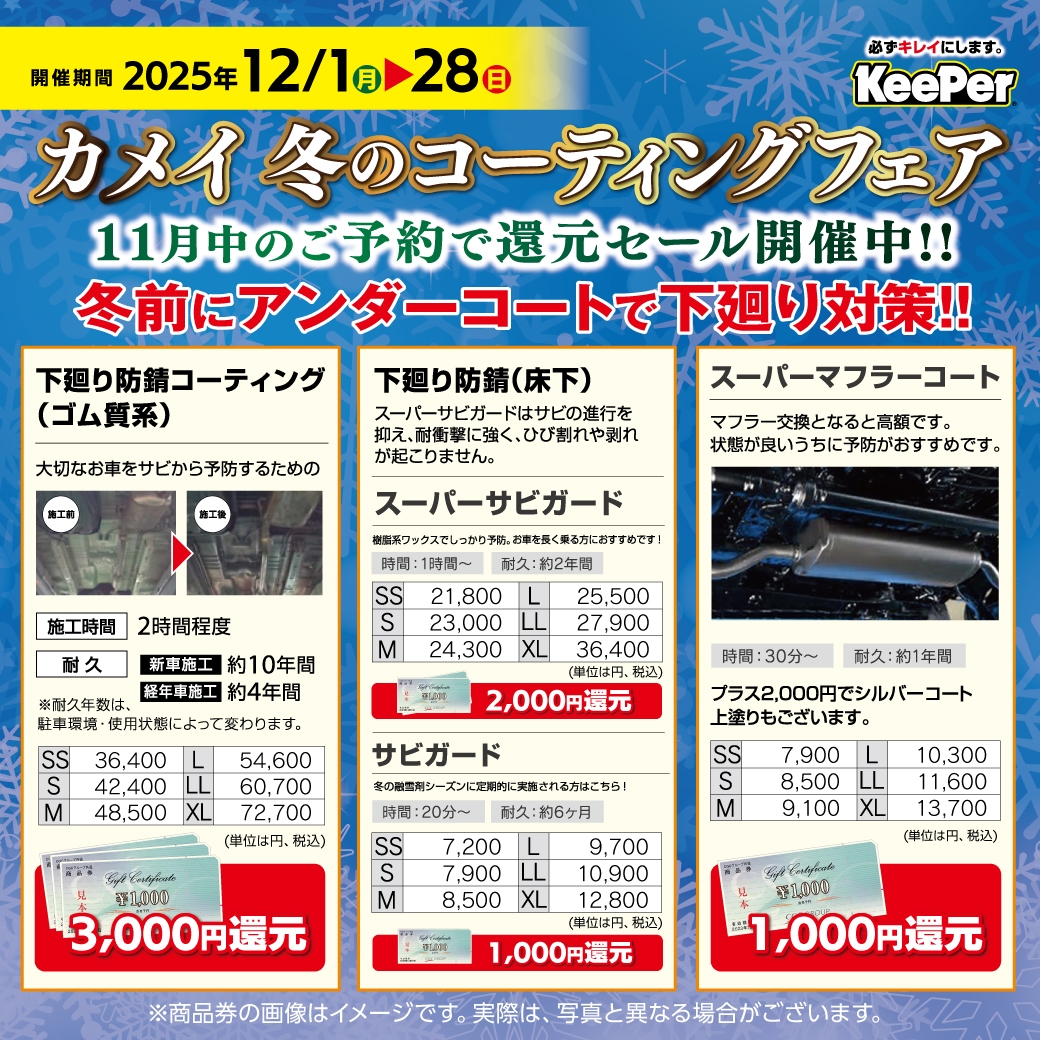 皆様こんにちは!八戸市にも雪予報が出ました! 今日の夜から降るらしいです。タイヤ交換はお済みでしたか? 今月から、カメイ冬のコーティングフェアを開催中です。 期間中(12月1日〜28日)にキーパーコ...