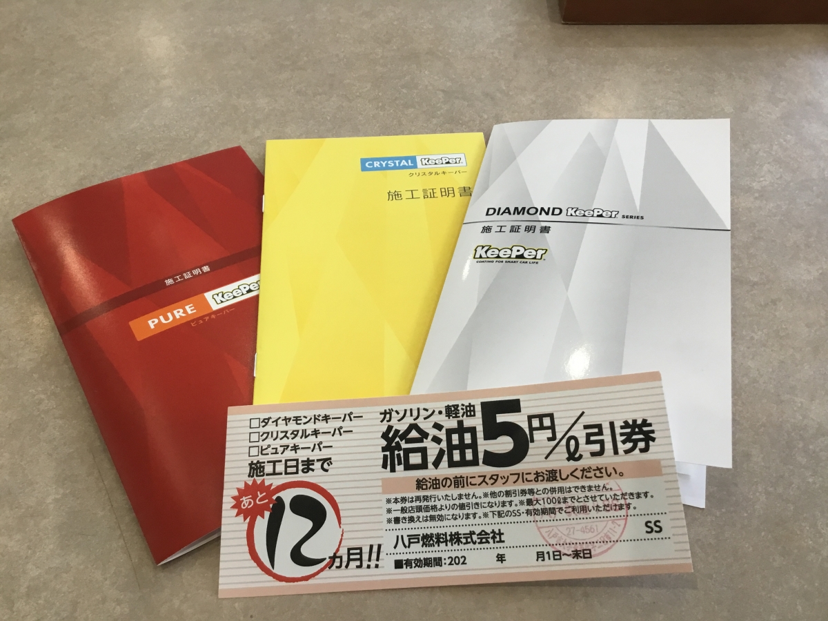 ○コーティング施工証明書 当店ではコーティングを施工されたお車に施工証明書を発行しております。 右からダイヤモンドキーパー、クリスタルキーパー、ピュアキーパーです。 万が一お車を板金修理などされる場合のコーティングの部分施工も承ります。 各種自動車保険にも対応しておりますので、大切に保管しておいてください。