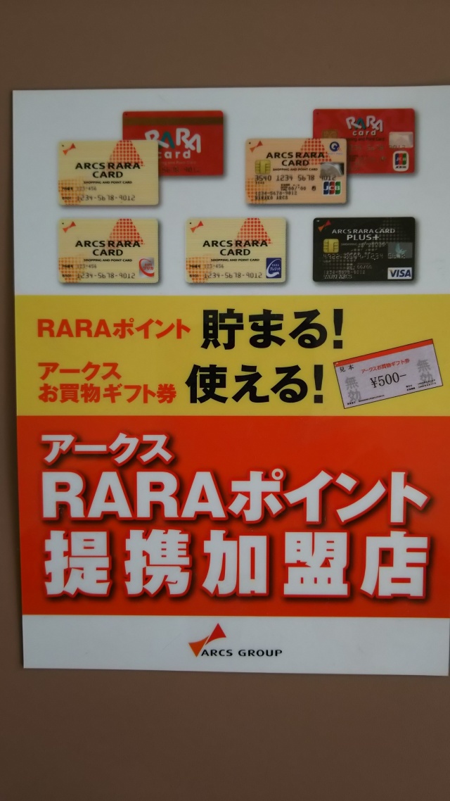 当店ではアークスRARAカードをご利用出来るようになりました。お会計の際にカードをお預かりするだけで燃料油、カーケア商品ご購入330円(税込)につき1ポイントつきます。