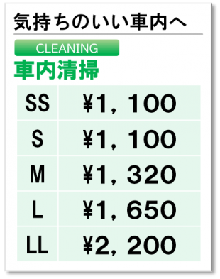 シート、マット、フロアの掃除機清掃と、内窓の全面清掃、ダッシュボード周りの拭き掃除がパッケージになっています。