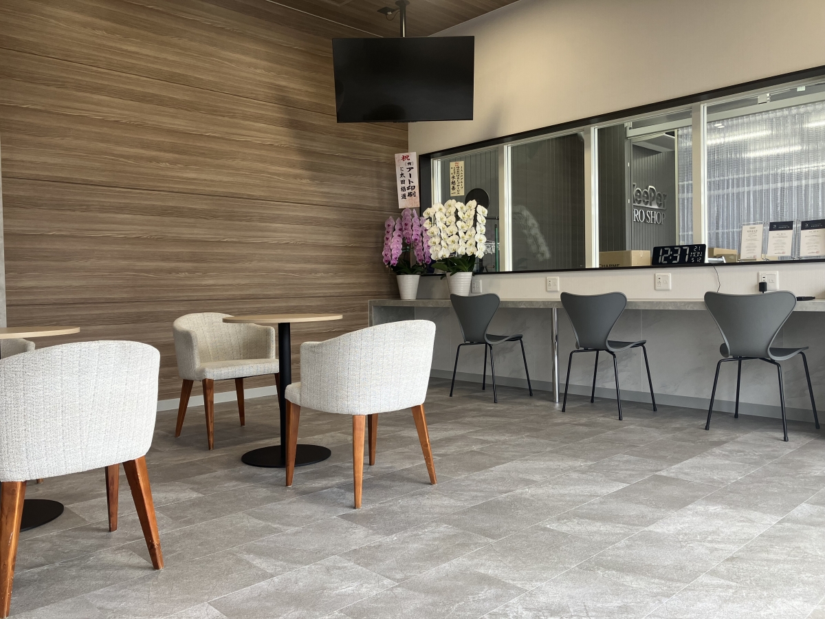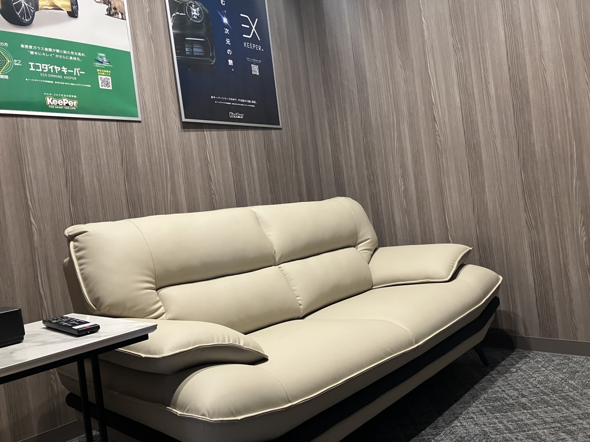大画面テレビとソファーでゆったりと過ごせます。手洗い洗車やコーティングの待ち時間などにおくつろぎいただけます。フリーWi-Fi、無料でお飲みできるバリスタも用意しておりますので是非ご利用くださいませ。