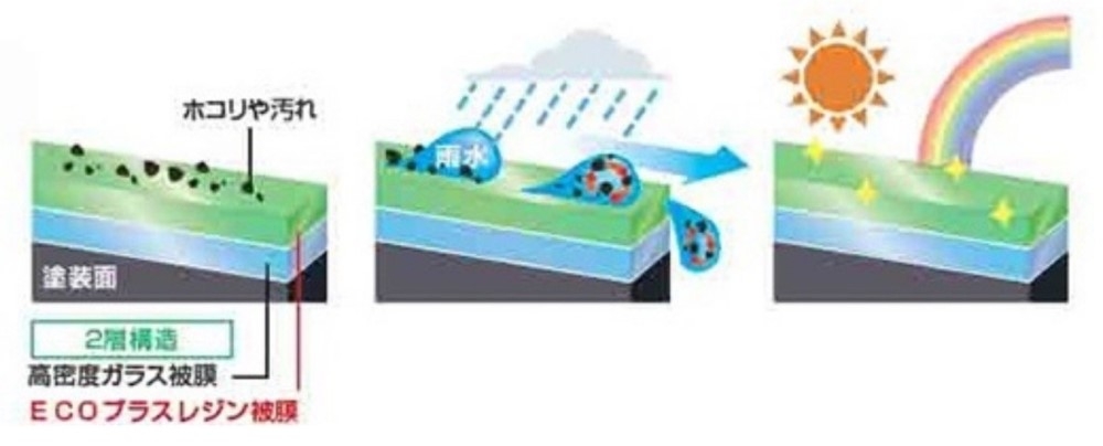 ECOプラス ダイヤモンドキーパーは、特殊なコーティング表面の分子構造の効果で、ファンデルワールス力(分子間力)による"汚れ"の密着を防ぐ独特な防汚能力を持ち、ホコリが降り積もっても、塗装表面には密着せず、自然の雨が降れば、元々持っている撥水力で弾かれた水と一緒に、ホコリなどの汚れが落ち、 まるで洗車をしたようにキレイになります。※雨自体が黄砂等を含んでいる場合は汚れます。(洗車をしてください)