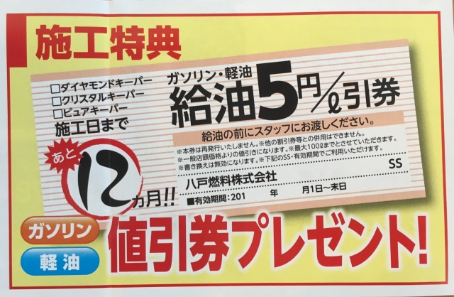 はちねん(ガソリン・軽油)給油5円引き/Lクーポンが付いてくる!コーティング後もお得♪♪♪